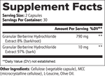 Ingredients: Granular Berberine Hydrochloride Extract 97% (bark), Granular Berberine Hydrochloride Extract 8% (bark/root), Cellulose (vegetable capsule), MCC (microcrystalline cellulose), L-Leucine, Olive Oil.